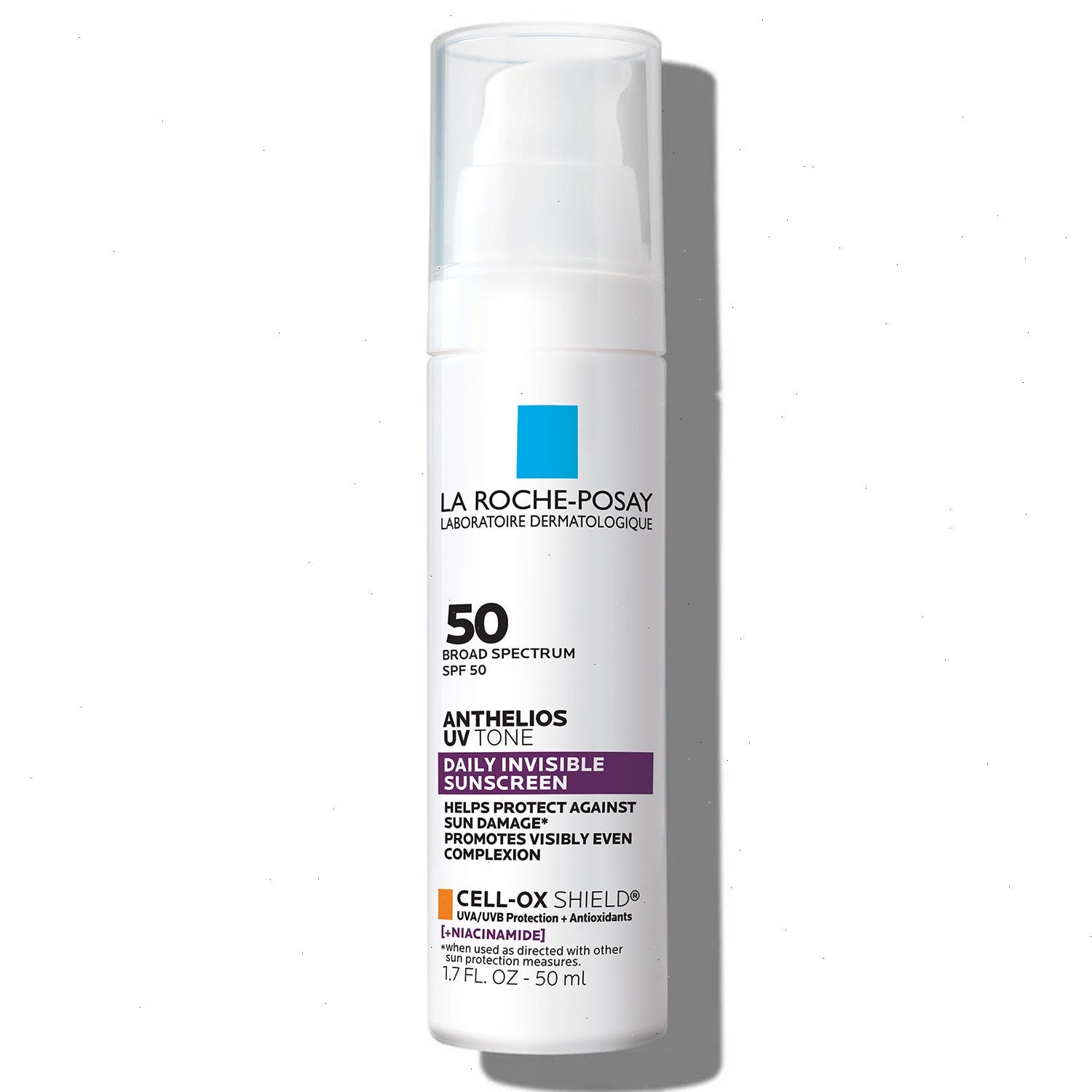 Anthelios UV Tone Sunscreen with SPF 50 helps improve the appearance of skin discoloration and protects against 98% UVB rays with Cell-Ox Shield® Technology. Formulated to help even skin tone with Niacinamide, this sunscreen helps smooth skin for a visibly radiant complexion. Its invisible, barely-there texture blends without a white cast for all skin tones and types. It provides glowy-looking skin while helping to decrease the risk of skin cancer and early skin aging caused by the sun*.